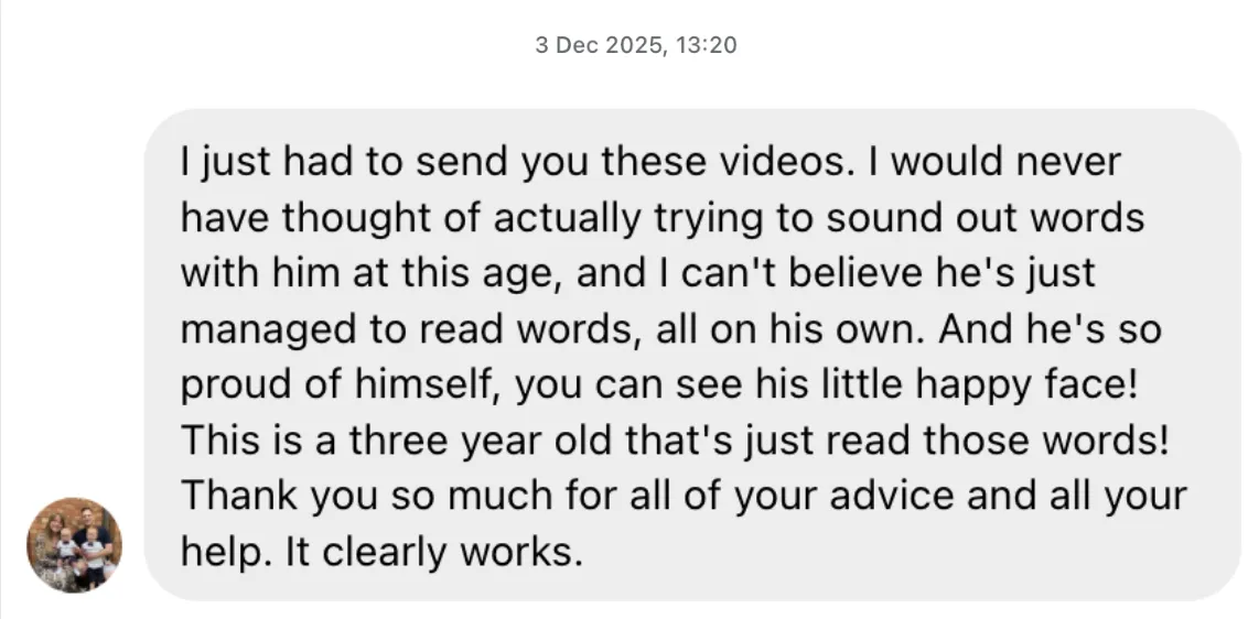 A free, 1:1 Assessment session with me, where we'll go over your child's reading together, find their strengths and any gaps they may be facing. This is done through your knowledge as a parent or carer and my knowledge as a phonics and literacy expert to give us a clear view of your child's current reading ability. I'll then personally guide you through the Community and show you the best place to start with your little one. I'll even email you everything we talk about to ensure you know the best games and activities to give your little one a head start! (Worth £60)